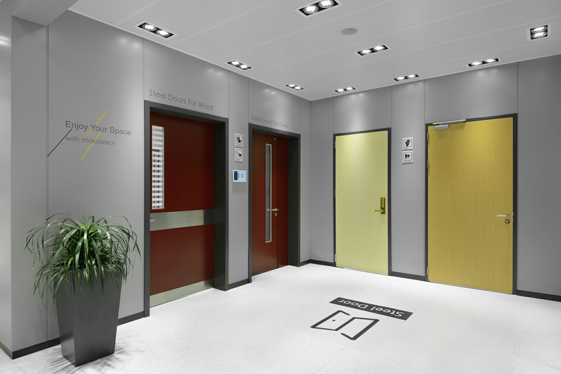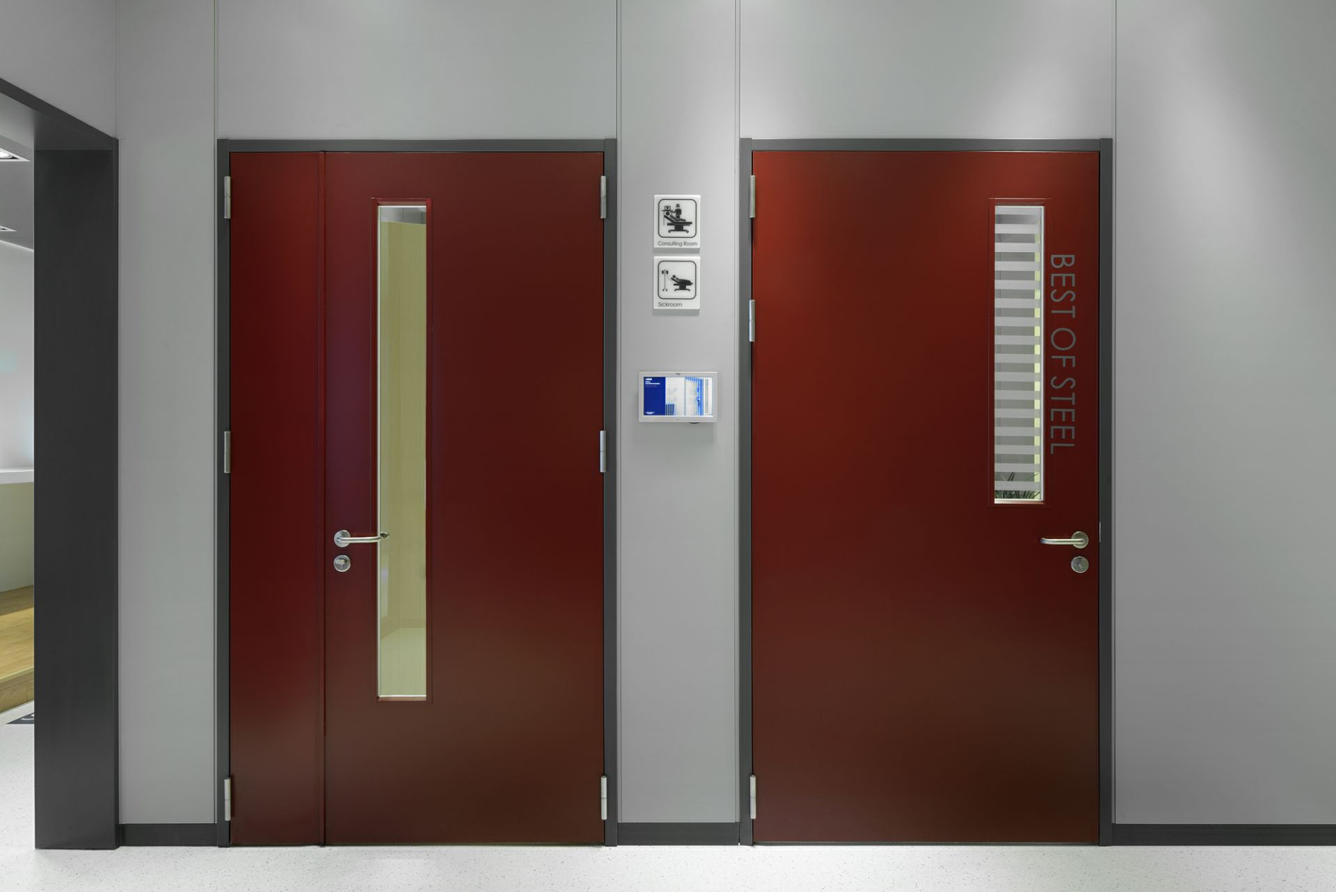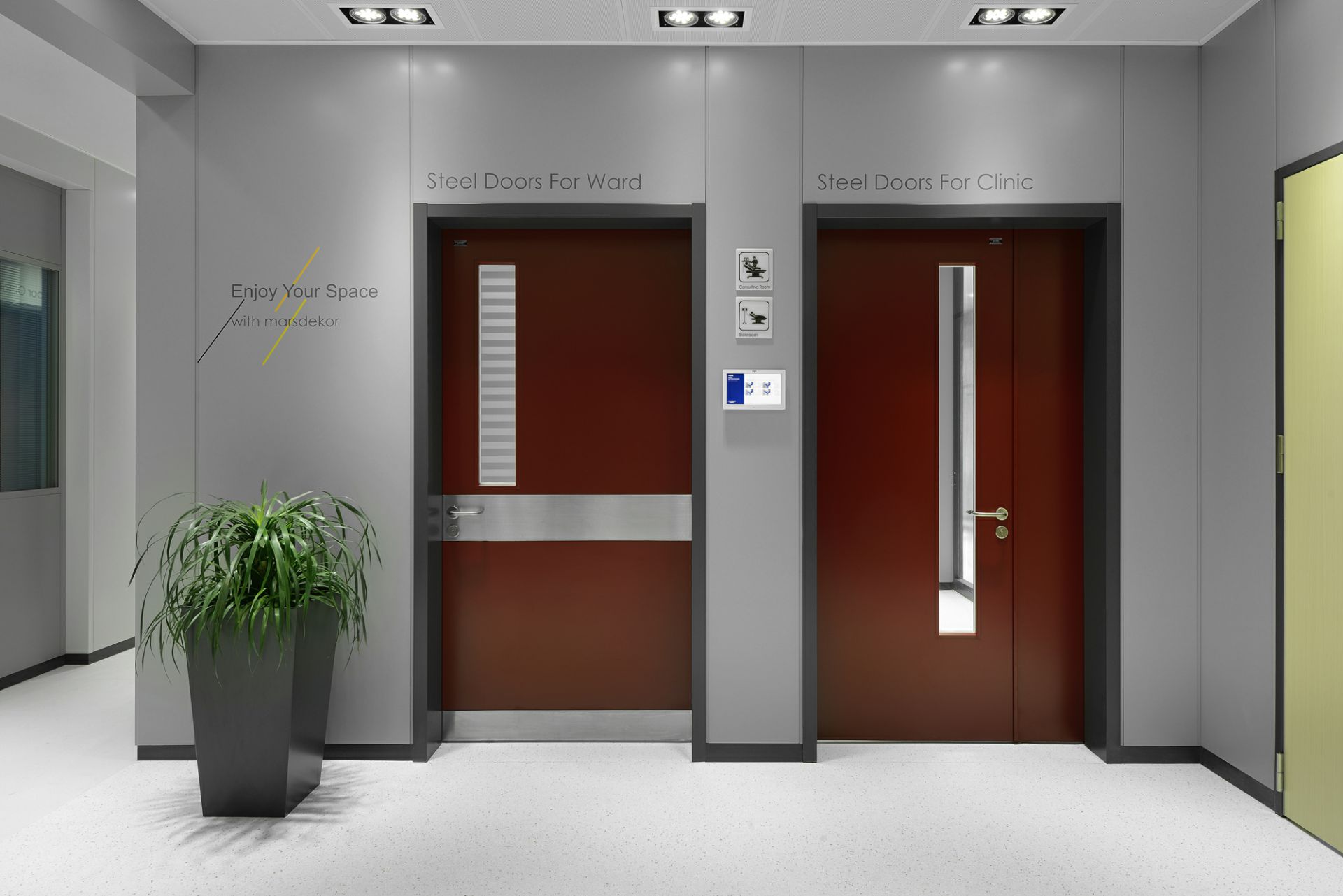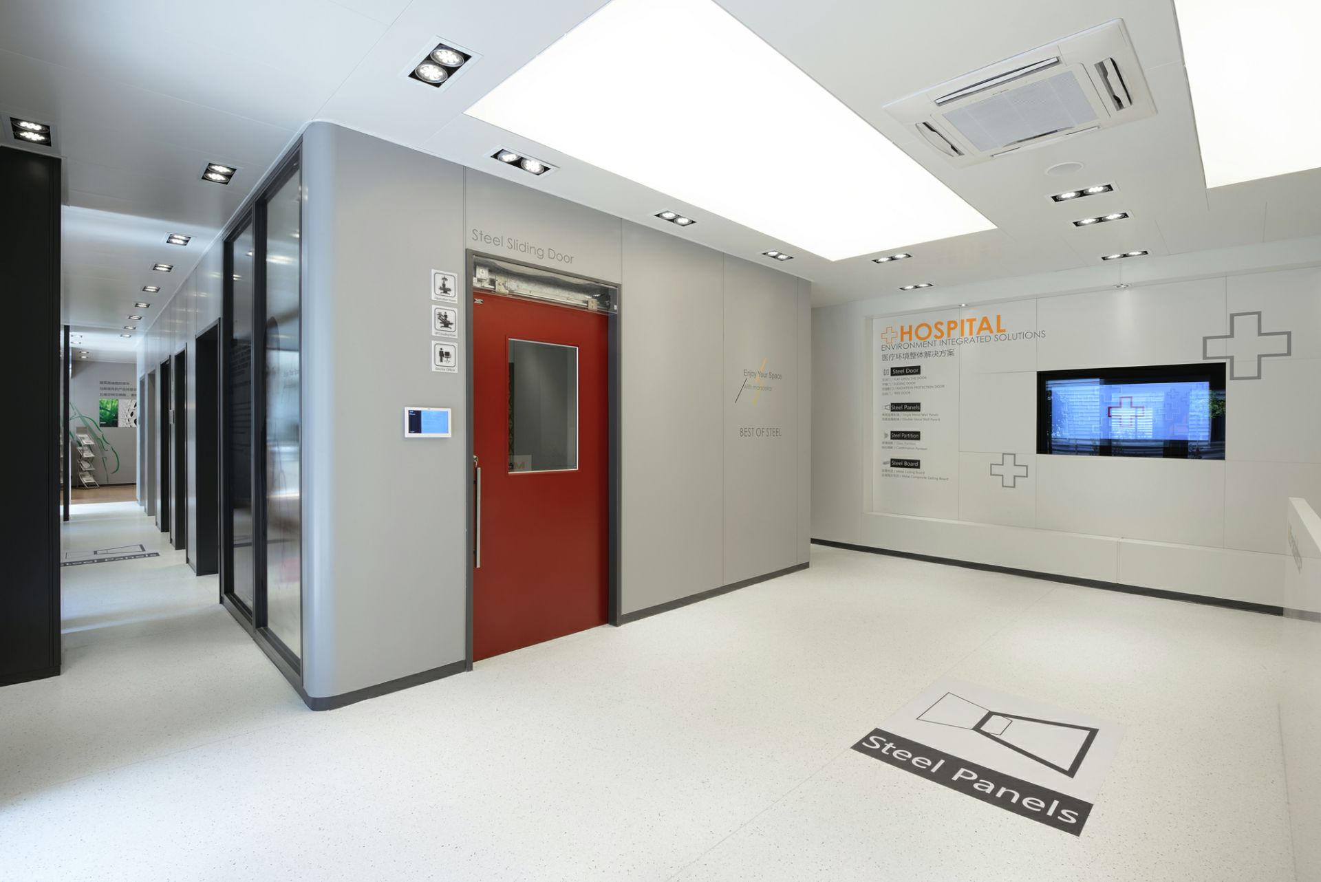 产品种类已覆盖医用钢质门、医用推拉门、室内门、防火门、钢质墙板、钢质空间隔断、金属吊顶等。从接待处到ICU,从化验室到手术室,从病房到行政办公,我们为医院空间环境设计研发多年的产品覆盖各类医院的特定需求..